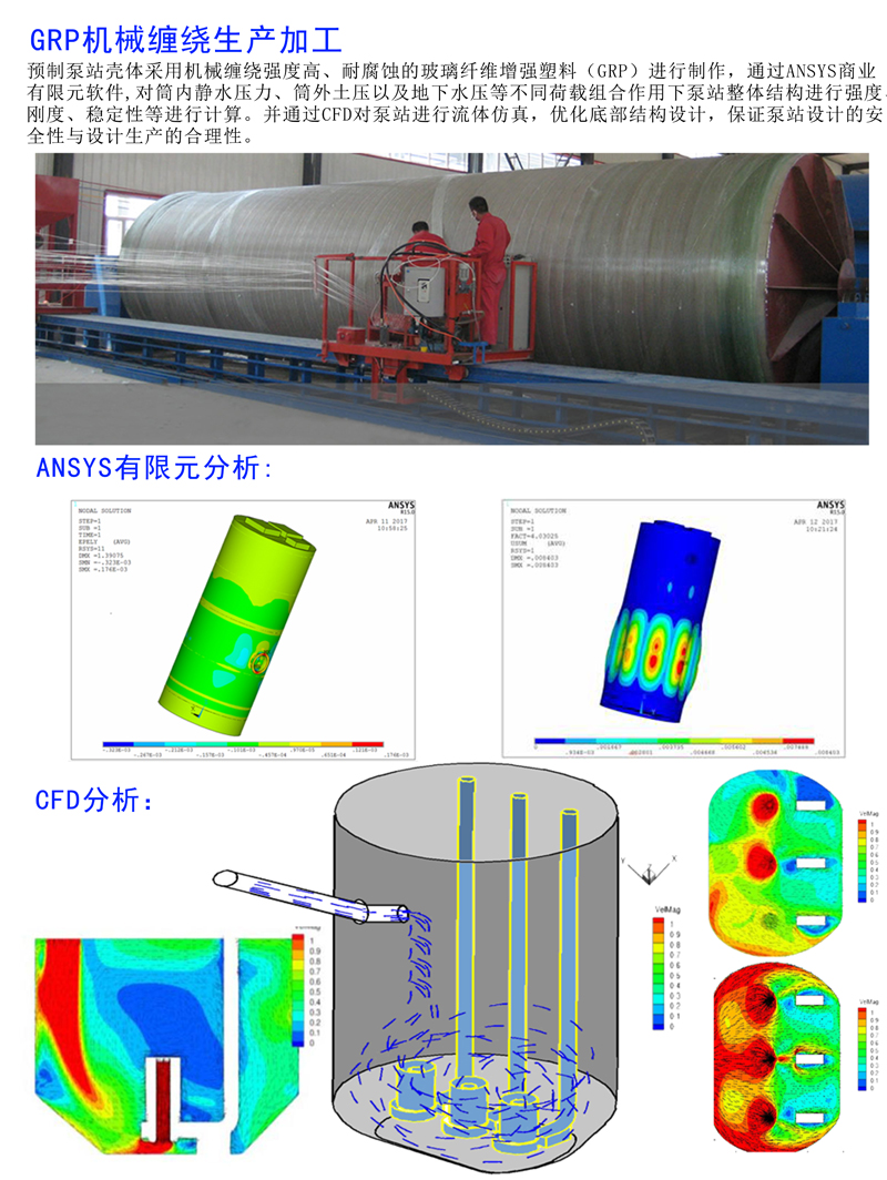 一體化預(yù)制泵站、一體化泵站產(chǎn)品概述產(chǎn)品特點(diǎn) 按需定制:每一套泵站都是根據(jù)客戶提供的參數(shù)設(shè)計,以保證泵站的運(yùn)行工況滿足使用要求。采用的CFD流體計算,使得盡可能把淤泥等固體顆粒排出設(shè)備。工控設(shè)計:根據(jù)用戶需要可采用施耐德電氣,觸摸屏設(shè)計,含通訊RS485接口。泵站具備手動控制、自動控制和遠(yuǎn)程檢測功能APP控制,不同控制方式之間可以自由切換。 新型材質(zhì):泵站簡體結(jié)構(gòu)由纖維纏繞玻璃鋼(GRP)制成,全自動化控制連續(xù)纏繞成型,確保厚度均勻并達(dá)到設(shè)計的剛度,質(zhì)量穩(wěn)定優(yōu)良。 配件標(biāo)準(zhǔn):所有配件都在工廠內(nèi)設(shè)計、制造完成,包括壓力管路、檢修平臺、進(jìn)出水管等,出廠前進(jìn)行嚴(yán)格的調(diào)試保證泵站的可靠性高度集成:泵站作為一體化設(shè)備,成套提供:泵站簡體、壓力管道、檢修平臺、檢修爬梯、格柵過濾裝置、耦合系統(tǒng)、泵提升系統(tǒng)、通風(fēng)裝置、防滑井蓋、照明系統(tǒng)等。 外形美觀:泵站全部埋于地下,地面只留有檢修孔和控制箱,也可選配景觀式管理房置于地上,與周圍環(huán)境相協(xié)調(diào)。 成本節(jié)約:泵站為成套供應(yīng),所有內(nèi)部安裝調(diào)試工作在工廠內(nèi)完成,現(xiàn)場只需將泵站整體安裝,極大地減少了土建施工周期和工程成本,降低了業(yè)主的整體投資使用壽命:泵站簡體材質(zhì)為玻璃鋼,內(nèi)部配件使用SUS304和熱鍍鋅等防腐材質(zhì),無需維護(hù)保養(yǎng),正常使用壽命可達(dá)30年以上。 檢修方便:水泵和提籃格柵全部配有導(dǎo)軌,檢修時可以快速的拆除和安裝。 功能擴(kuò)展:預(yù)留通訊接口,方便客戶集中化管理。